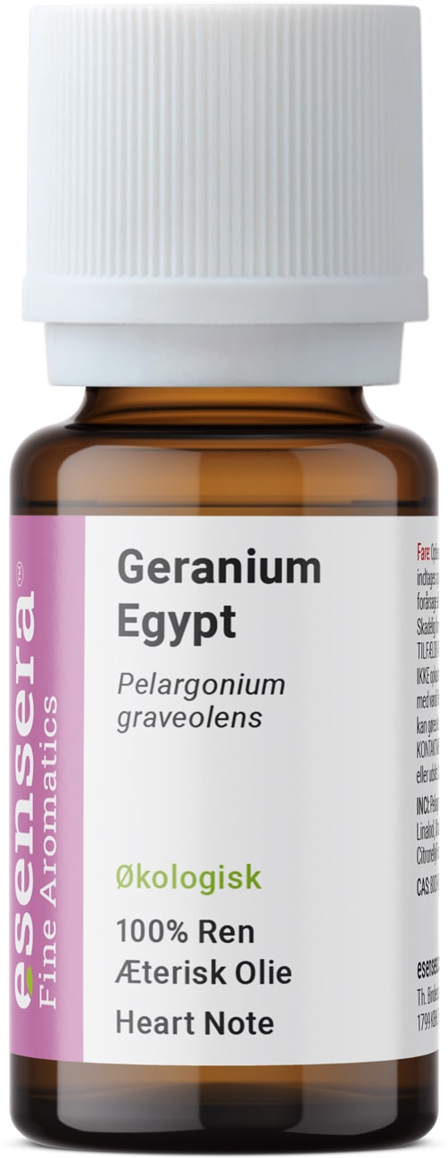 Økologisk Geraniumolie fra Egypten har en kraftig, sød, frisk og let frugtig blomsteraroma med undertoner af urter og mynte. Meget ren aromatisk profil. Fra Robertet.