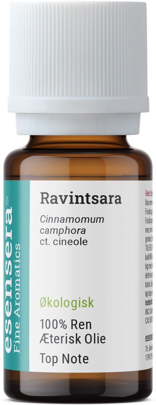 Ravintsara er Madagaskars friske åndedræt fra naturen - sprød, let kamfer, rig på Cineole og deraf meget Eucalyptusagtig og samtidigt med blød Tea Tree. Vanddampdestilleret af bladene fra Kamferlaurbær-træet, som på Madagaskar har udviklet sig til den særlige Cineole-kemotype, der adskiller sig fra den klassiske kamfer-olie, vi kender.